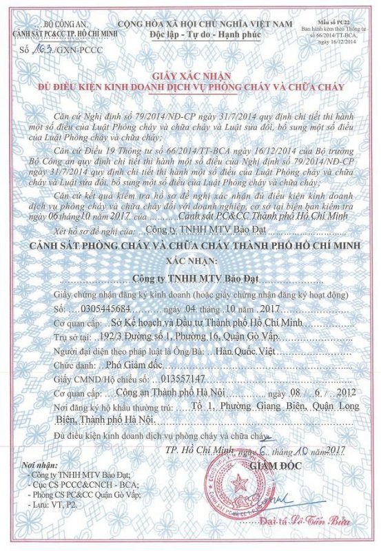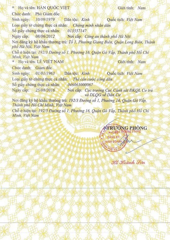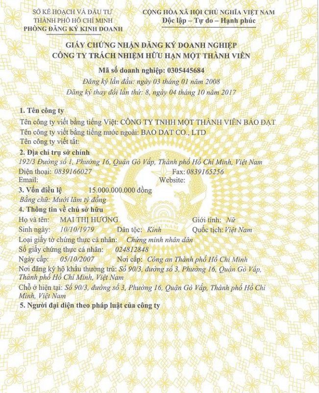 Giấy phép: GPKD số 0305445684, ngày 03 tháng 01 năm 2008 do Sở Kế Hoạch và Đầu Tư Thành Phố Hồ Chí Minh cấp.